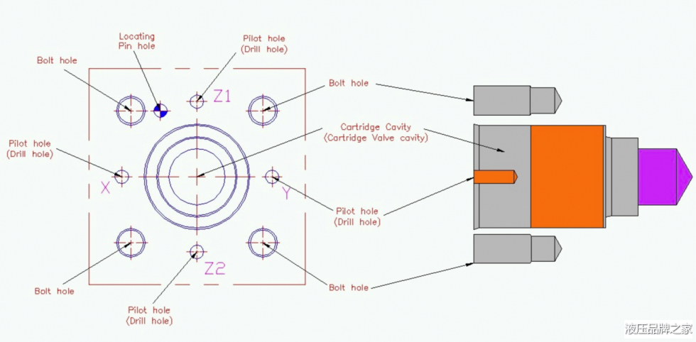安装图通常包含不同的孔腔类型;螺栓孔用于安装阀块,定位销孔用于在正确的方向定位阀块,其他孔是用于阀块的不同端口。